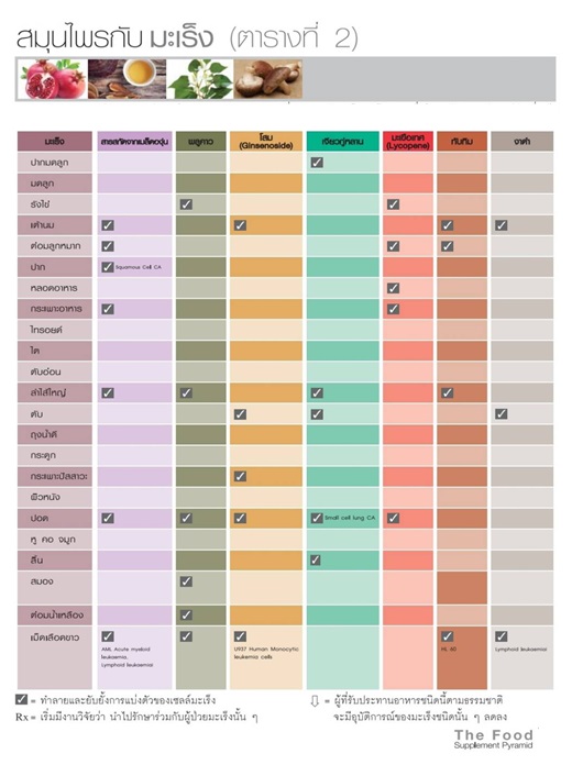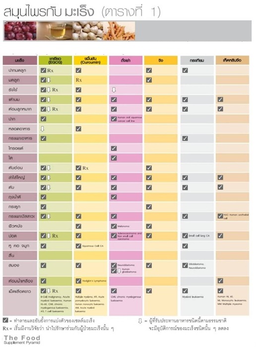 สมุนไพรที่มีงานวิจัยว่า สามารถยั้บยั้งการแบ่งตัว(Antiproliferative)และทำลายเซลล์มะเร็งของคนให้ตายได้ (Apoptosis) แสดงตามตาราง ดังนี้